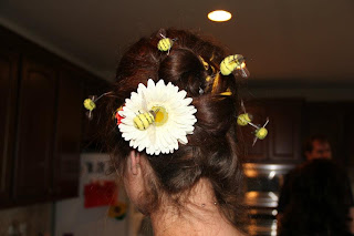 I apologize for the quality of the picture but, meh. You get the gist. I styled my hair into a traditional 50's/60's style beehive (didn't get it quite as high as I've seen them- but I was short on time!) Then I attached craft bees (found in the floral section of my craft store) to wires and wrapped them around bobbypins. I finished it off with retro make up- lots of powder, cat eyeliner, false lashes, and red lipstick! I was pretty pleased with the outcome!
